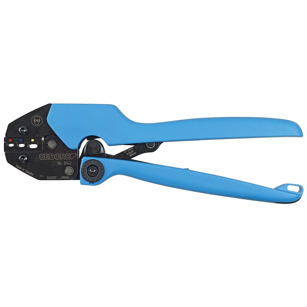 8142 Precíziós présfogó szigetelt csatlakozókhoz; Egyedi mechanizmus biztosítja a kéz erőteljes csökkentését más préselő eszközökhöz képest, Rugalmas és könnyű, Jobb- és balkezesek számára egyaránt, Pozitív zárás a préselés befejezésének biztosítására, Kibocsátó mechanizmus a helytelen préselés és blokádok eltávolítására, Precíziós excentrikus beállítás állandó présminőséghez és kalibrálási funkcióhoz, Alkalmazási tartomány: 1: 0,5-1,0 mm² / 20-18 AWG 2: 1,5-2,5 mm² / 16-14 AWG 3: 4,0-6,0 mm² / 12-10 AWG
