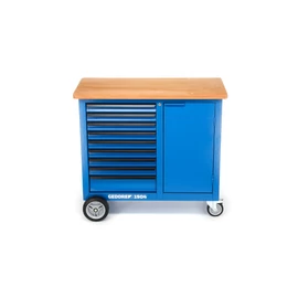 1504 0810 Mobil munkapad 9 fiókkal; Fiókok egymás utáni működtetése és biztonsági zár, Terhelhetőség fiókonként 40 kg, alsó nehéz teherbírású fiók 60 kg, Központi zár cylindertárcsás zárral, Statikus teherbírás 1000 kg, mobil üzemben 500 kg, Méretek: M 985 x Sz 1100 x M 550 mm