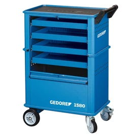 1580 Eszköztároló kocsival 4 fiókkal; Test: Méretek: M 930 x Sz 625 x H 400 mm, Mindkét oldalon fémszekrények a teljes belső tér biztonságos zárásához, Munkalap strapabíró ABS műanyag lapból, Fogantyúval könnyű tologatás, húzás és fordítás, Oldalfalak Euro furattal 10 x 38 mm a horogok és eszközök rögzítéséhez, Biztonság a sarkvédelemmel és minden oldalról ütközésvédelemmel az emberek és a környezet védelme érdekében, Lemez acél, korrózióálló és karcolásálló porfestéssel, GEDORE kék, Fiókok: Központi zárás cilinderzárral, 4 széles fiók (Sz 480 x H 325 x M 45 mm), minden fiók mindkét oldalon kihúzható, 1 nagy tárolótér az alsó részen, Görgős sínek golyóscsapágyakkal, középen és végén fogókkal, Egyedileg felszerelhető hosszanti és keresztirányú elválasztókkal (egyedileg rendelhető), Terhelhetőség fiókonként 20 kg, Lemez acél, korrózióálló és karcolásálló porfestéssel, GEDORE kék, GEDORE futómű: Teljes teherbírás 300 kg, 2 nagy teljesítményű görgők golyóscsapágyakkal (rögzített görgők átmérője 140 mm), 2 golyóscsapágyas GEDORE könnyen gördülő görgők (forgó görgők átmérője 100 mm), egyik teljes fékkel, A GEDORE trapéz alakú tengely szerkezete biztosítja a sima futást, manőverezhetőséget és az úton tartást még maximális terhelés esetén is, Tartozékok: 8 hosszanti (LT) és 2 keresztirányú elválasztó (QT) galvanizált lemez acélból, Opciók: Felszerelhető GEDORE eszközmodulokkal (1500 ES/1500 CT), Igény szerint bővíthető GEDORE mellékfiókkal 1430-as számú, Különleges színek és kialakítások kérésre elérhetőek, Szállítás eszközök és tartozékok nélkül